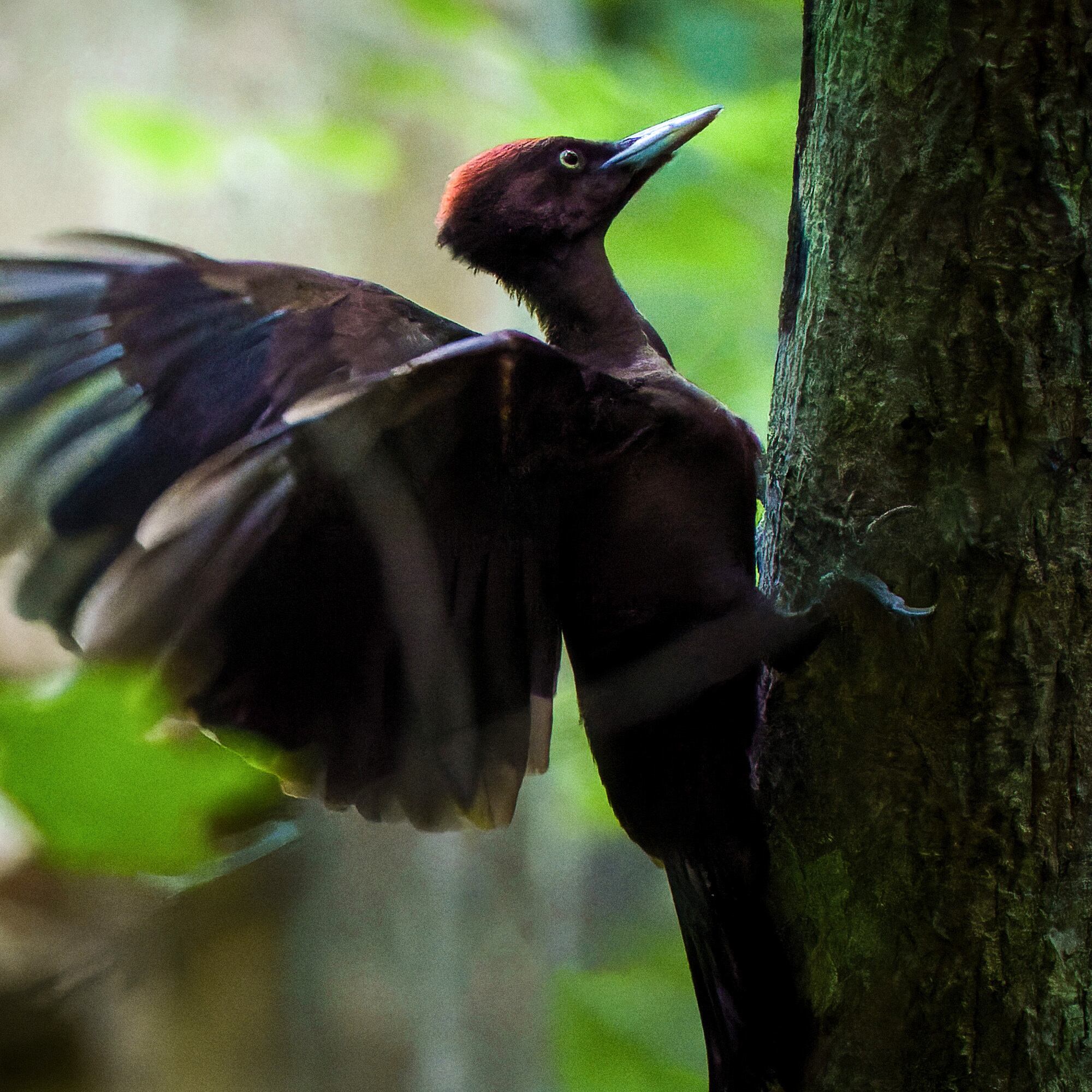 小雨の森の中で、クマゲラが羽を広げた一瞬を撮りました。