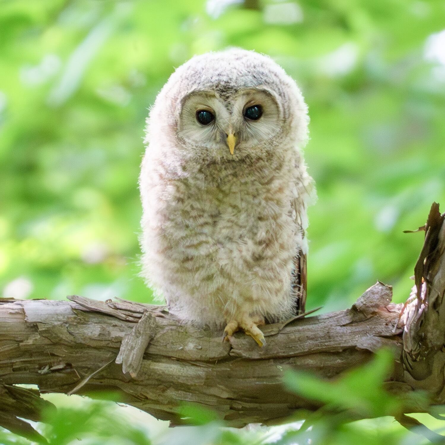 まだフワッフワの産毛のフクロウの雛です。この年、撮れたフクロウ雛の中では、一番、至近距離で撮れたので、顔の毛並みまでしっかりピントが合いました。